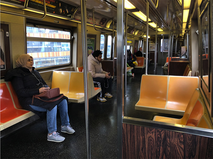 NYの地下鉄は、1本の路線の半分以上が地上部分を走っている路線も多く、この座席に座れると、自分の空間が持てたようで心地が付く。一緒にいる仲間がいれば、互いの顔を見ながら会話も弾む。