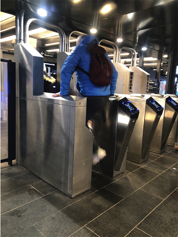 ▲写真料金を払わず改札を飛び越える人。5分待てば1人は必ずいる。無賃乗車の背景には貧困だけでない複雑な問題が絡む(筆者提供)