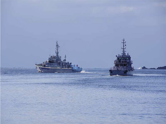▲写真 隠岐諸島沿岸に、漂流・漂着する朝鮮半島からのものと思われる木造船等の早期発見と、G7広島サミットを控えたテロ対策及び不正薬物等の密輸入阻止を目的に隠岐海上保安署巡視船さんべと神戸税関の監視艇おきとの合同パトロール(2023年2月16日 隠岐諸島沿岸)出典:海上保安庁ツイッター