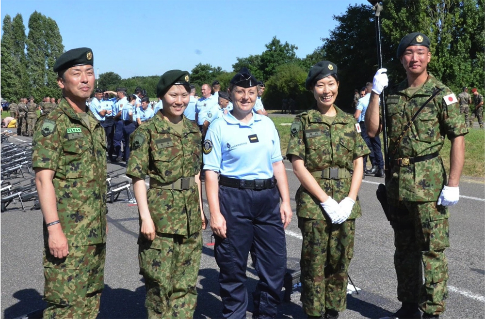 ▲写真 フランス国家憲兵隊女性隊員と陸上自衛隊の隊員。写真中央右の女性隊員は本年度「国民の自衛官」に選出された第32普通科連隊本部管理中隊の池内2曹、写真中央左の女性隊員は同じく本部管理中隊の熱海3曹(2018年7月10日 フランス・パリ)出典:陸上自衛隊facebook