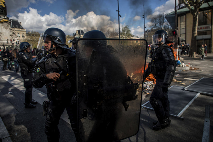 ▲写真 フランス大統領選挙第1回投票前夜、パリで発生したデモの警備にあたる国家憲兵隊の隊員ら。(2022年4月9日 フランス・パリ)出典:Photo by Carlos Gil Andreu/Getty Images
