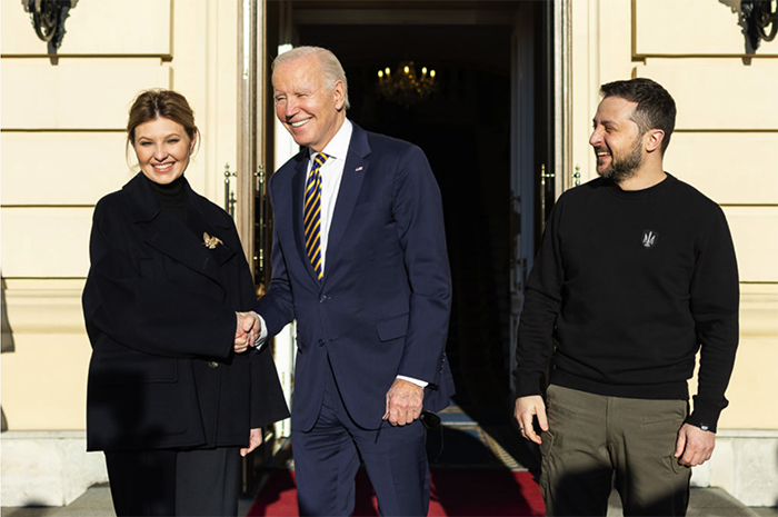 ▲写真 ウクライナを電撃訪問しゼレンスキー大統領夫妻に出迎えられるバイデン米大統領(2023年2月20日、ウクライナ・キーウ)出典:Photo by Ukrainian Presidential Press Office via Getty Images
