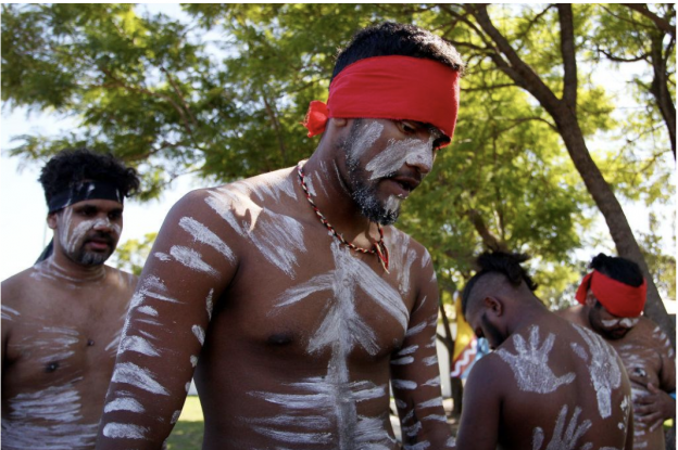 写真:グレートバリアリーフ世界遺産地域を通過する石炭船の移動の増加等に反対する緑の党が主宰した反アダニデモに集まった原住民ら 2019 年 4 月 28 日、オーストラリア・クレルモン