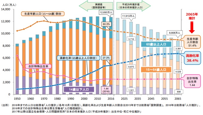 少子高齢化が進行していることは誰でも知っているだろうが、下の図を見てもらいたい。65歳以上人口の割合(高齢化率)は上がり続けており、2022年にはすでに約30%に達している。3人に1人は高齢者というのもすごい。2065年には高齢化率が4割近くに迫る。
