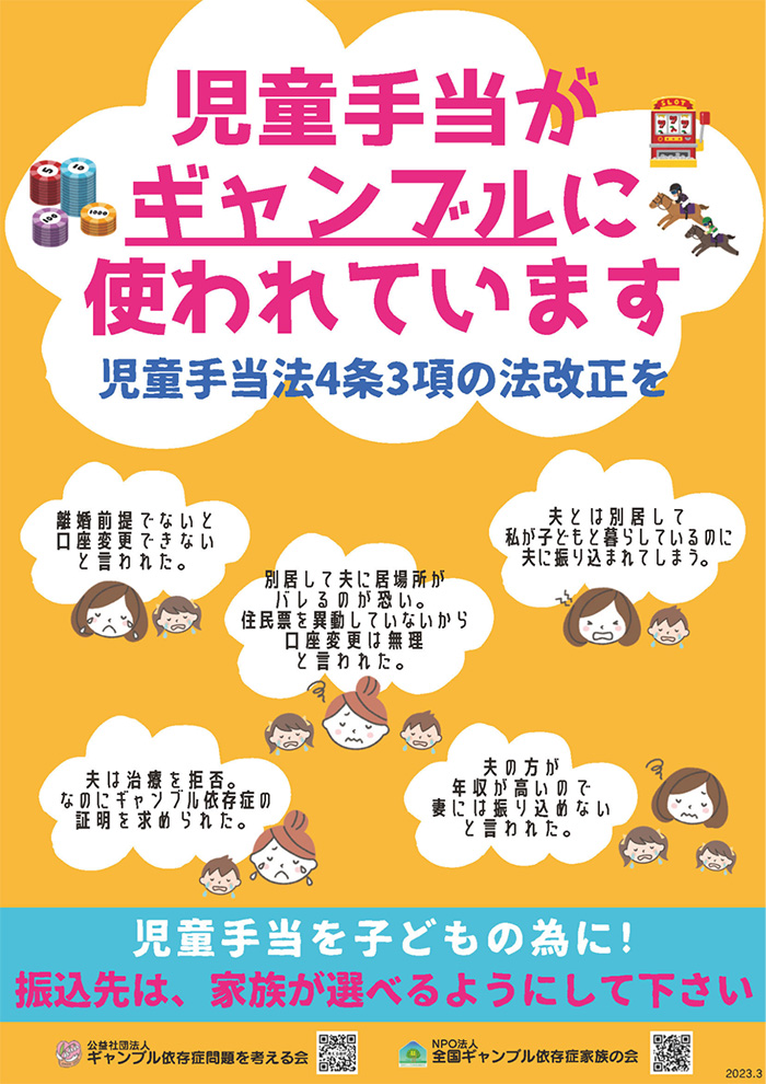 そこで当会では今後「児童手当法4条3項」の改正を求めて働きかけを行っていくこととした。ギャンブル依存症者を持つ家庭と同様に、この問題で困難を抱えている団体の方は協働して欲しいと願っている。