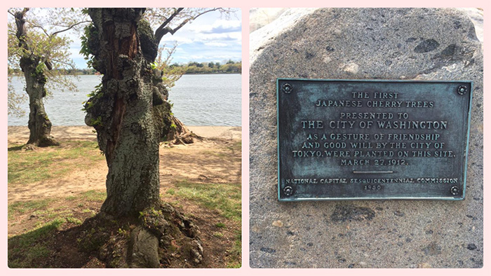 ▲写真 ワシントンDCに今も残る、1912年に、最初に植樹された2本の桜の木のうちの一つと、説明がある銘板(筆者撮影)