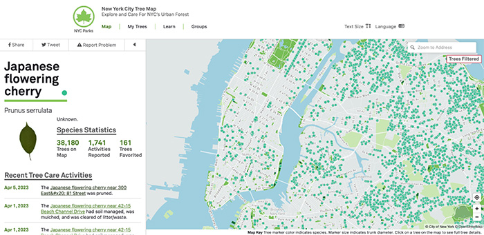 ▲写真 ニューヨーク市内に街路樹として植えられている、日本の桜の場所を示すNY公園管理局のウェブサイトの地図 出典:NY公園管理局のウェブサイト