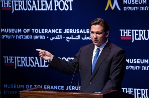 写真)イスラエルのエルサレムで開催されたエルサレム・ポスト会議でスピーチをするフロリダ州知事のロン・デサンティス (2023.4.27 イスラエル)