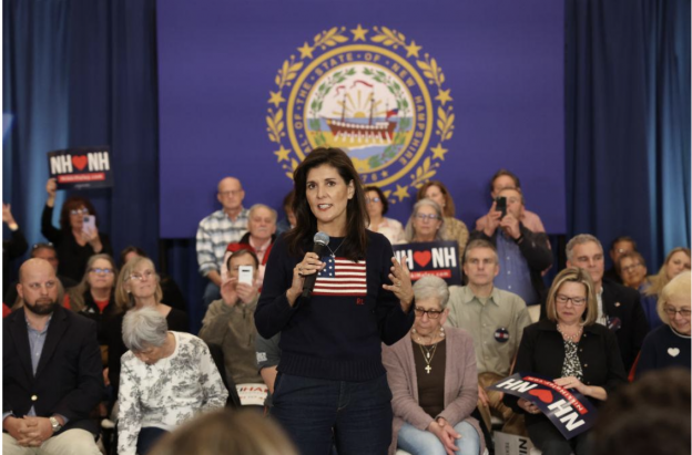 写真)ニューハンプシャー州ベッドフォードで行われたタウンホールイベントでスピーチする、共和党の大統領候補で元国連大使のニッキー・ヘイリー(2023.4.26 ニューハンプシャー州)