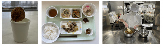 写真)左から順に「グリラスかぼちゃコロッケ」、「メニュー全体」、調理風景