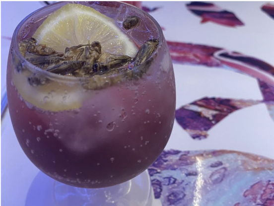 ドリンクメニューもユニーク。「タガメサイダー」や、コオロギ、ハチミツ、ハイビスカス、ジンジャーを合わせた「MUSHIサワー」などがある。サワーの上にはコオロギがトッピングされていて、カリカリとした触感だ。すっきりと飲みやすい。