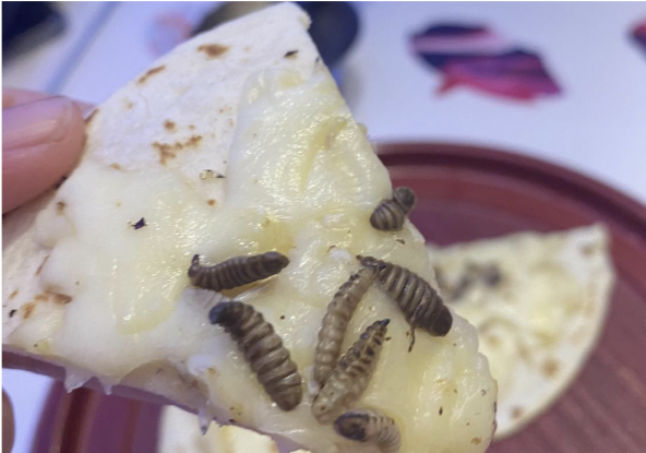 こちらはパリパリのピザ生地にプチプチとした食感のマゴットとミズアブが乗っている「薄焼き虫ピッツァ」。チーズの味で虫の風味はかき消されているが、虫を単体で食べてみると独特の食感と匂いがする。