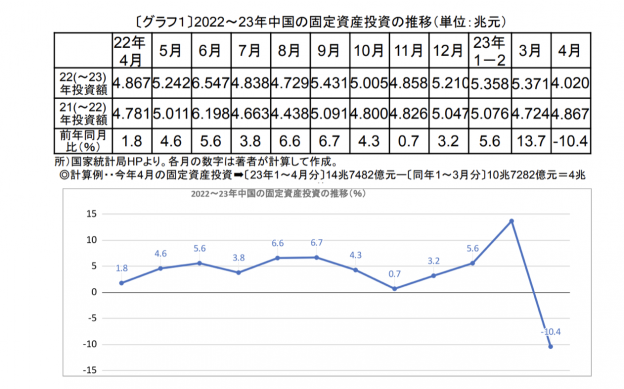 ここで、2014年~23年まで1-4月(累計)固定資産投資の図表を作成してみよう(グラフ2)。