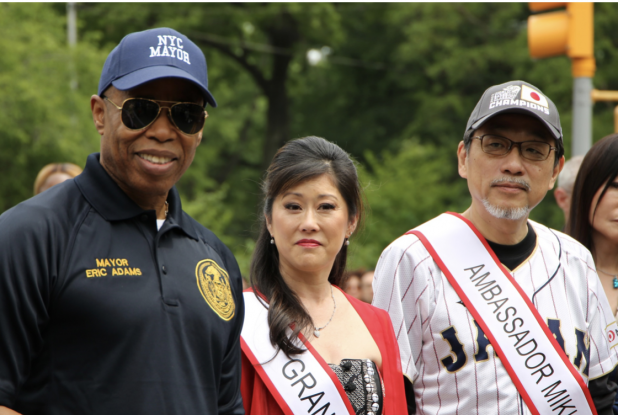 写真)パレードに参加した、エリック・アダムスNY市長、冬季オリンピック・フィギュア金メダリスト、クリスティ・ヤマグチ氏、森美樹夫・在ニューヨーク日本総領事館大使。森大使は侍ジャパンのいでたちⒸ柏原雅弘