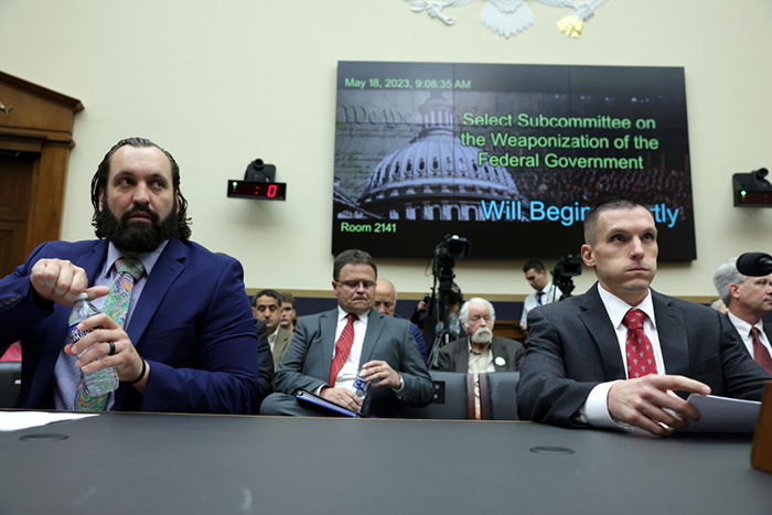 ▲写真:下院司法委員会に設置された「連邦機関の武器化調査委員会」の公聴会に呼ばれ、開会を待つ停職中のFBI特別捜査官(左)と元FBI捜査官(右)(2023年5月18日 米連邦議会)出典:Photo by Alex Wong/Getty Images