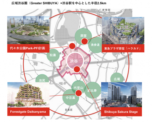 ・東急グループが渋谷駅から半径2.5kmを広域渋谷圏(Greater SHIBUYA)として再開発中。