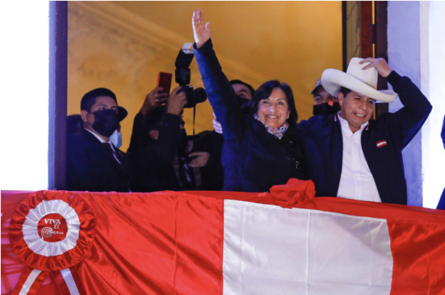 写真)選挙本部で支持者に手を振るペルーの新大統領に確定したペドロ・カスティジョ大統領と副大統領候補のディナ・ボルアルテ(2021年7月19日 ペルー・リマ)