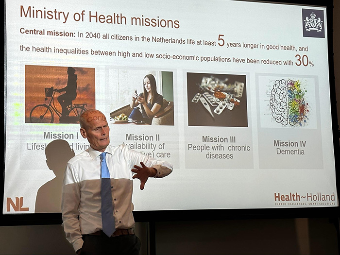 ツアー初日は、オランダ企業庁の健康・福祉部門である「Health Holland」エグゼクティブディレクター ニコ・ファン・メーテレン教授/博士がオランダのヘルスケア政策を紹介した。