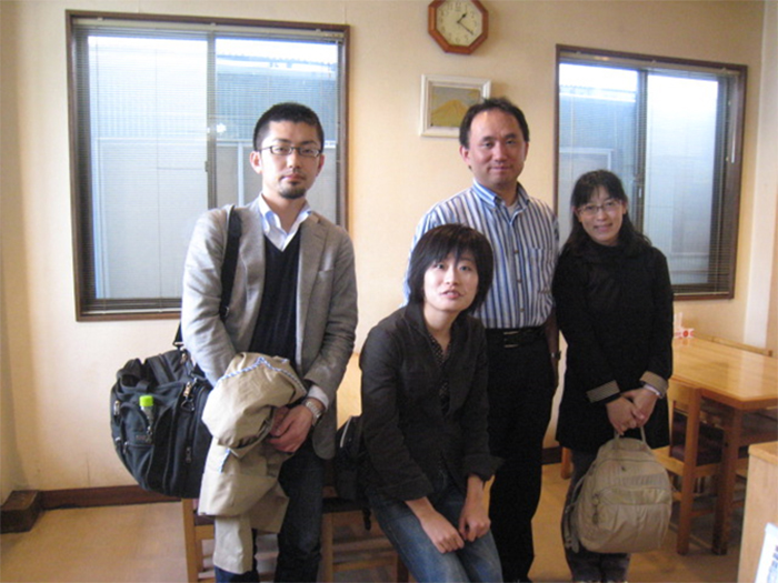 ▲写真 常磐線 原ノ町駅周辺の定食屋で。左から加納昭彦記者、高橋幸江医師(東京都立駒込病院)、筆者、松村有子医師(東京大学医科学研究所)2011年4月29日(執筆者提供)