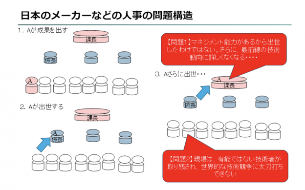 特に人事の問題。電機メーカーや半導体メーカーでは、現場で優秀な技術者がどんどん出世し、管理職になると、現場を離れてしまったため有能ではなくなる現象が起こる。マネジメント力があるわけではなければ、余計に有能ではなくなる。そして、現場には優秀でない技術者が残され、競争が激しい最新技術についていけない・・・こういう「構造」があったと言われている。