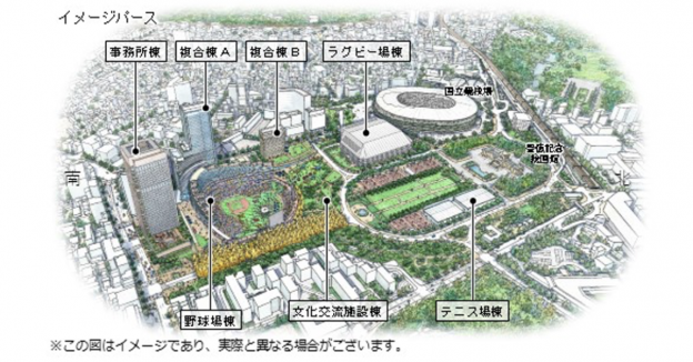 宗教法人明治神宮、独立行政法人日本スポーツ振興センター、伊藤忠商事株式会社、三井不動産株式会社が主体となった都市開発。