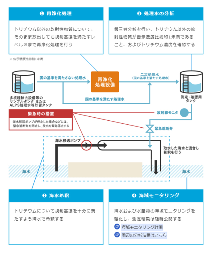 ALPS処理水の海洋放出を行う際には、トリチウム以外の放射性物質の濃度が国の基準を満たすまで再浄化処理(二次処理)を行い、トリチウムの規制基準を十分に満たすよう海水で希釈する。その工程は以下の図の通りだ。