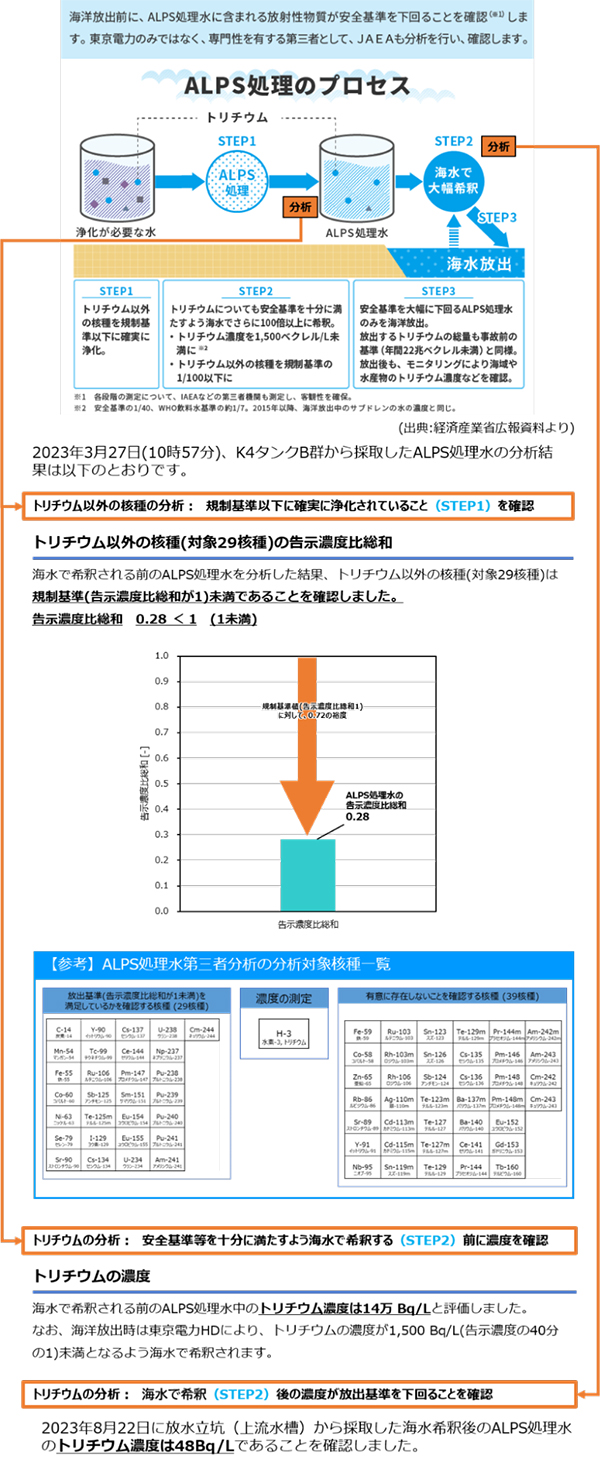 また、海水希釈前のALPS処理水のトリチウム以外の核種(対象29核種)は、規制基準(告示濃度比総和が1)未満であることが確認されている。(注1)