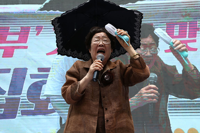 ▲写真 日本大使館前で、第73回光復節を記念する集会に出席して演説する李容洙(イ・ヨンス)さん(2018年8月15日 韓国・ソウル)出典:Photo by Chung Sung-Jun/Getty Images