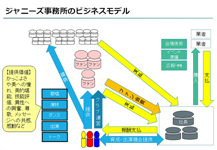 ジャニーズ事務所のビジネスモデルは、美少年のショービジネスといっていい。美少年の歌、曲の販売、踊り、テレビや演劇での演技を提供し、その対価を得て、さらに、ファンクラブ経営で会費収入を得るというもの。素晴らしいエンターテイメントを国民、いや世界の人々に提供してきたことも確か。簡単にビジネスモデルをまとめると以下の図のようになる。