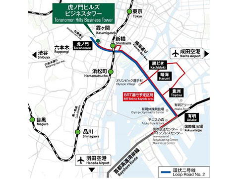 「虎ノ門ヒルズ ビジネスタワー」は、東京メトロ日比谷線新駅「虎ノ門ヒルズ駅」(2020年6月6日開業)や、銀座線「虎ノ門駅」と地下通路でつながり、1階部分には空港リムジンバス(現在休止中)や都心部と臨海部を結ぶBRT(バス高速輸送システム)のバスターミナルがある。虎ノ門ヒルズ地区からは、臨海部の東京ビッグサイト(東京国際展示場)まで車で10分程度、羽田空港の第2ターミナルまでも最速約18分で行けるようになった。まさに「東京の玄関口」といってもいい。