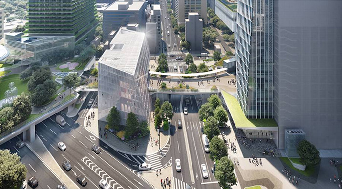下には国道1号線(桜田通り)が走っている。デッキは歩車分離を実現し、安全・安心な街づくりに貢献するだけでなく、街区や幹線道路を跨いだ東西のメインストリートとしての機能も持つ。