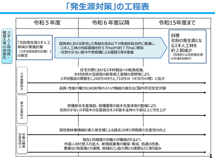 中身を見てみると、人工林の伐採・植替えの加速化では、本年度中に重点的に伐採・植替え等を実施する区域を設定する。さらに伐採面積を5万ha/年から10年後には7万ha/年まで増加させるという。その他、スギ人工林の伐採・植替えの一貫作業の推進、伐採・植替えに必要な路網整備の推進、意欲ある林業経営体への森林の集約化の促進などを進める。さらにスギ材を活用した木造建築物の着工の増加、住宅分野におけるスギ材製品への転換促進で、スギ材製品の需要を現行の1,240万㎥から10年後に1,710万㎥に拡大するなど林業の再生までも視野にいれる。また、花粉の少ない苗木の生産拡大として、官民連携で花粉の少ないスギ苗木の生産割合を現行の5割から10年後に9割以上に引き上げることなどが明らかになった。