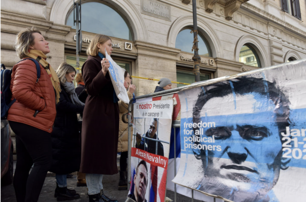 写真)イタリアのロシア人コミュニティの活動家が、現在ロシアで投獄されている野党の指導者アレクセイ・ナワリヌイ氏とすべてのロシアの政治犯の自由のために行ったサンティアポストリ広場でのデモ イタリア・ローマ 2023年1月21日