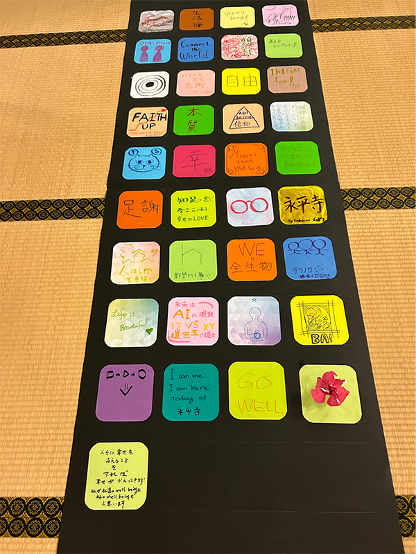 イベントの後半は、「地域社会」「コミュニティ」「命」「信仰」「テクノロジー」など異なる分野とウェルビーイングとの関連を考えるグループ対話。ランダムに集まった参加者どうしがつながり、真剣な対話が、対面で集まった意味をさらに深める。