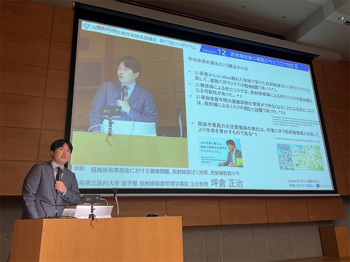 ▲写真 2022年11月27日、現場からの医療改革推進協議会シンポジウムで講演する坪倉教授(筆者提供)