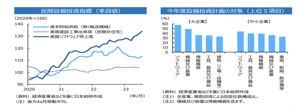 左の方のグラフに示されているように、従来のような「ハード」な投資ではなく、「省力化や情報化対応に向けたデジタル投資が、今後の設備投資のけん引役に。」「(上記4ページ)とあるように、「ソフト」、バズワードで示せば、「DX、AIなどによる投資」への強いトレンドが見て取れます。