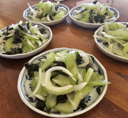 - セロリを4-5ミリの斜め薄切りにし、小さじ1強の塩で塩もみをし、約五分置いておく。その間にセロリを揉む。