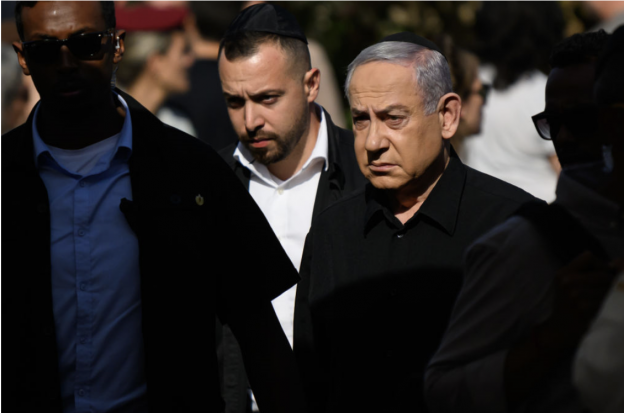 写真)ガザの戦闘で死亡した、元陸軍参謀総長の息子(25)の葬儀に出席したネタニヤフ首相(2023年12月8日 イスラエル・ヘルツリーヤ)