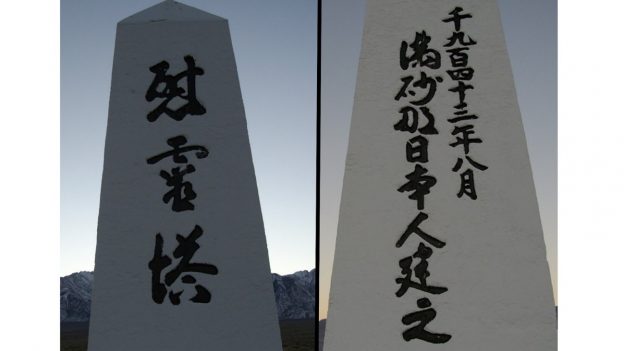 Manzanarの収容所内で亡くなった人は150人に上りますが、その多くが乳幼児や未熟児でした。今でも大きな慰霊塔が残っていて、その横には見事な字で、「千九百四十三年八月 満砂那日本人建之」と書いてあります。「日本人」と明記してあるのです。慰霊塔の下には、引き取り手のない小さな墓がまだいくつか残っていました。