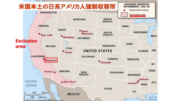 この地図の中の太平洋岸沿いのピンク色の地域がExclusion areaです。Exclusion areaに住んでいた日系人は強制的に排除されて、10カ所の収容所のいずれかに送られました。当時のアメリカ大統領フランクリン・ルーズベルトは、日本による真珠湾攻撃を考えると、日本軍がこの地域の日系人と合流して太平洋沿岸からアメリカ本土に侵攻する可能性が高いと判断して、1942年2月、大統領令9066号に署名し、強制的にこの地域の日系人を排除することを決定したのです。