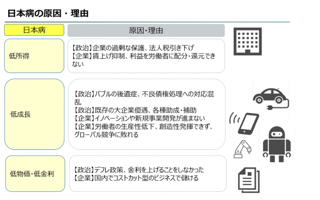 日本経済が抱えているのは「日本病」である。低所得・低物価・低金利・低成長、海外からは「日本化」、Japanificationと呼ばれている。ああはなりたくないという恐れから、日本の不況は世界の研究テーマになっている。1人当たりGDP、平均賃金、労働生産性、仕事の満足度、やりがい、企業の競争力など世界をリードどころか、OECD各国の中でも劣っている現状にある。技術レベルは世界でも有数だが、IT、DX、人材育成、イノベーションにも完全に出遅れ、権威主義的組織風土がまだ企業競争力やイノベーションを阻害している。本来議論され、実行されるべきなのは、個人の創造性を促し・デザイン思考を進めイノベーションをどう起こすのか、起業をどのように推進していくのか、失われた30年間の変わらない大企業優先・業界団体の企業風土をどう変革し、公平公正な競争環境を作るのか、業法の規制緩和をどう進めるのか、雇用の流動化で産業構造改革をどう促すのか、海外のプラットフォーム企業の寡占化をどう防止するのかなどなど、このあたりが明確にされてこなかったし、取り組みが不十分であった。