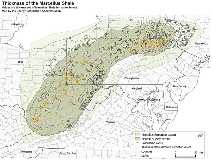 ▲図 マルセラス・シェール層は広大で複数の州にまたがっている。ワシントン(District of Columbia)・ニューヨークなどからの距離も近い。米国エネルギー情報局資料。