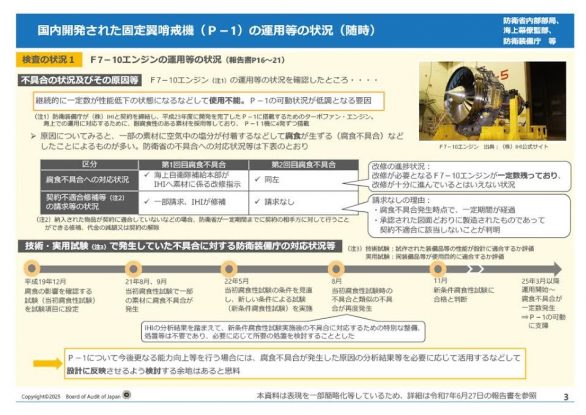 開発時からF7-10エンジンに腐食の問題が生じており、このため不具合が発生していたにも関わらず、装備庁はその事実を直視せずに調査も業者任せにしていた。