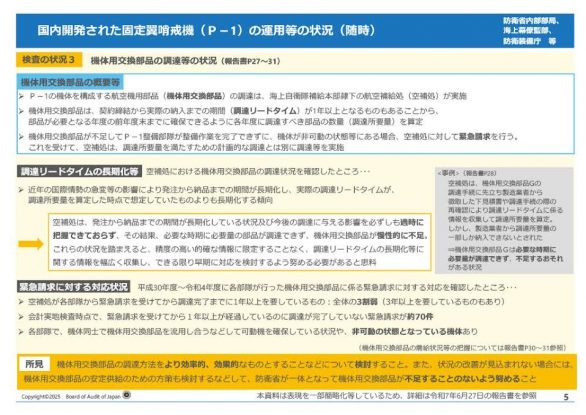 イ P-1の可動状況が低調となっている状況や、機体用交換部品が不足している状況等を踏まえて、機体用交換部品の調達方法をより効率的、効果的なものとすることなどについて検討すること。また、状況の改善が見込まれない場合には、機体用交換部品の安定供給のための方策も検討するなどして、防衛省が一体となって機体用交換部品が不足することのないよう努めること 会計検査院としては、P-1の運用等の状況について、引き続き多角的な観点から検査していくこととする。