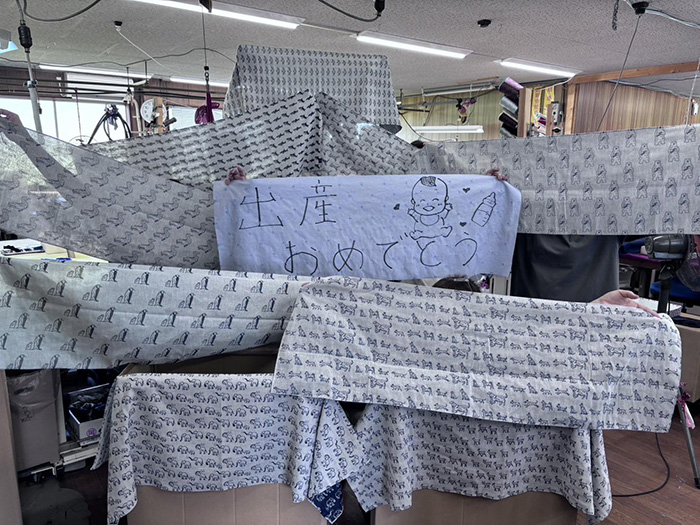 今回、私の第二子誕生をお祝いするために職人たちが在庫の中から引っ張りだしてきてくれました。そして改めて触った職人たちがざわつき始めて……。普段、最高級のシルクを触り慣れていて、さらに子育て経験のある職人が、「これは良い」と太鼓判を押しました。