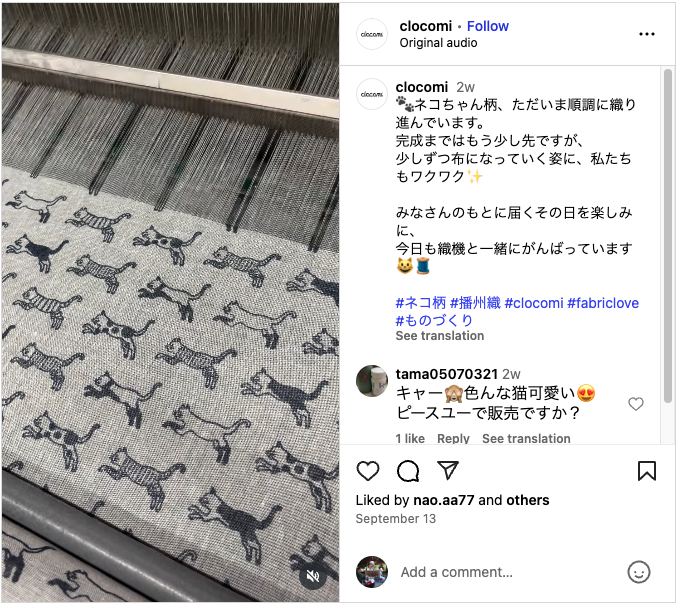 とは言え、転機はありました。発進軸を「日本製」に定めたのです。それまではプライベートや仕事における経験についても伝えていましたが、日本製を中心に伝えるよう仕切り直したらグングン伸びました。そこにきて播州織の投稿がきて、短期間で3万人が新たにフォローしてくださった、と。