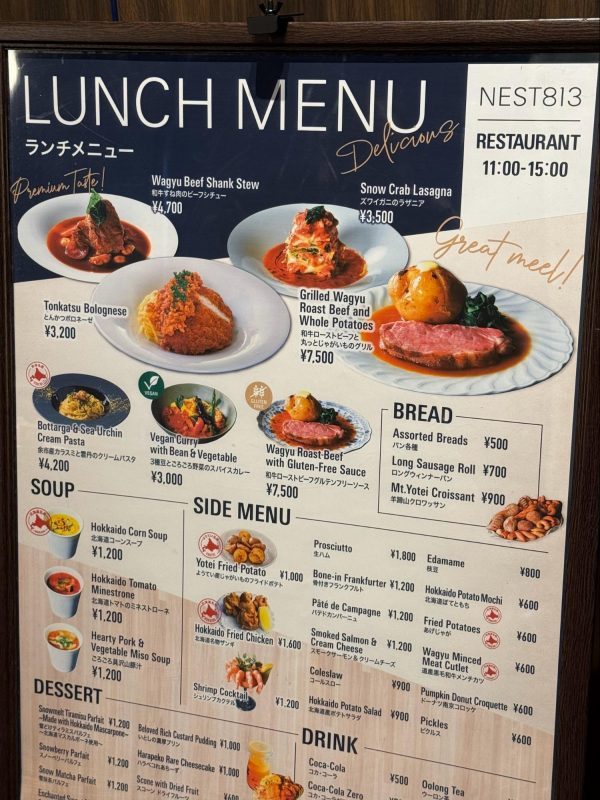 見どころは、オープンキッチンでシェフがゲストの目の前で仕上げる「和牛ローストビーフ(1皿7,500円)」。厳選された和牛の塊肉が、分厚いステーキのような贅沢さでカットされる様子は圧巻だ。目の前にそびえる羊蹄山のパノラマを眺めながら味わうこの一皿は、もはや「ゲレ食」のイメージを超えている。その他、和牛すね肉のビーフシチュー、ズワイガニのラザニア、とんかつボロネーゼなどなど・・・中央に構えるバーカウンターで注文したワインやシャンパンで乾杯すれば、もはやスキー場にいることを忘れてしまいそうだ。