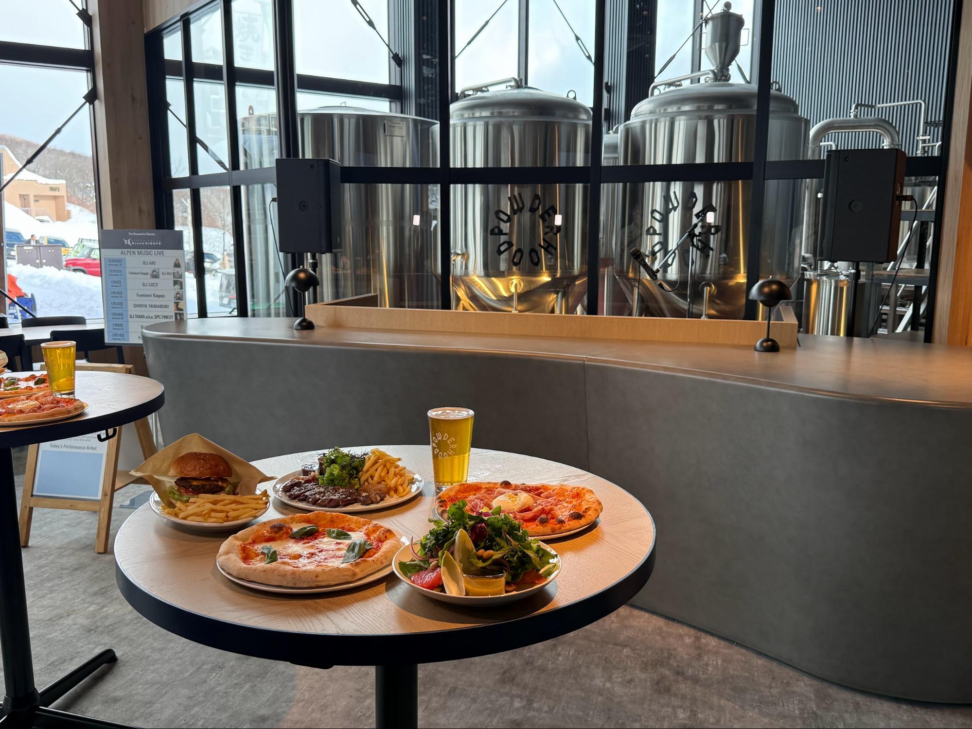 核となるのは、クラフトビール醸造所を併設したレストラン「POWDERHOOD RESTAURANT & TAPROOM」。エースゴンドラ山麓駅舎横という抜群の立地に完成した。巨大な醸造タンクが鎮座する店内では、ここでしか味わえないフレッシュな一杯が提供される。ビールの種類は10種以上、単に食事をするだけでなく、醸造文化に触れる体験を提供することで、冬のスキーヤーはもちろん、夏の観光客をも惹きつけそうだ。