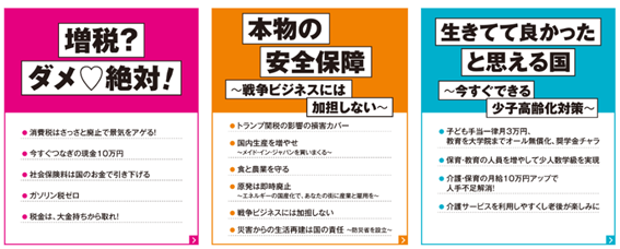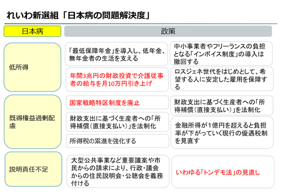 ・れいわ新選組の公約は国民目線で分かりやすいが、子育て手当や介護・保育の賃上げなど、実現性に課題がある。