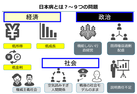さて、「社会の医者」こと筆者西村健は、「日本病」として9つの問題を提示しています。経済の「日本病」と言われる、「低所得」「低成長」「低金利」の問題だけでなく、